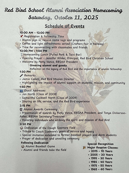 The Red Bird School Alumni Association (RBSAA) will hold its annual meeting on Saturday to bestow several annual awards. Alumni Jon (’08) and Samantha (’09) North are set to deliver an inspiring message as the keynote speakers after lunch. The gathering will move outdoors for the formal dedication of the Daugh Sizemore Field and the presentation of the new electronic baseball scoreboard, a project sponsored by RBSAA.